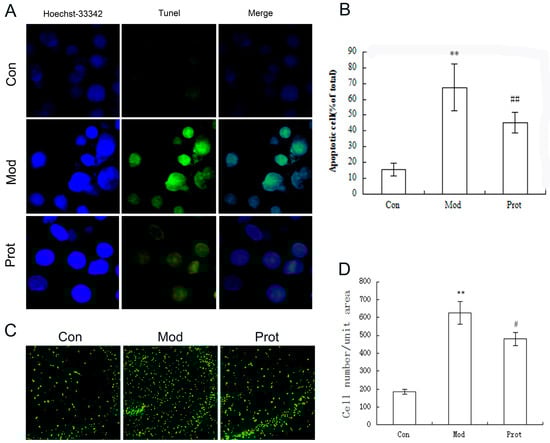 Protective effect of quercetin on H2O2 induced apoptosis in PC-12 cells and organotypic hippocampal slice were evaluated by TUNEL assay. (A) Representative images of TUNEL assay in PC-12 cells (400×); (B) quantification of TUNEL-positive cells in A; data collected from 10 fields for each group; experiments were repeated three times; (C) representative images of TUNEL assay in organotypic hippocampal slice (100×); and (D) quantification of TUNEL-positive cells in (C); data collected from 10 fields for each group; experiments were repeated three times. Data are expressed as overall mean ± SD of the ratio of apoptotic cells to the total number of cells. Statistical significance was determined using the Student’s t-test (** p < 0.01vs. control; ## p < 0.01, # p < 0.05 vs. model). Con, untreated; Mod, H2O2 treated; Prot, quercetin + H2O2 treated.