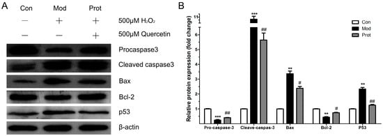 Effects of quercetin on expression of apoptotic proteins in H2O2-induced PC12 cells. (A) Western blot analysis of the expression of p53, Bcl-2, Bax, procaspase-3, cleaved caspase-3; and (B) the band intensities were measured with the Image J program, and shows the relative protein expression of quercetin on the expression of apoptotic proteins (n = 3). ** p < 0.01, *** p < 0.001 vs. control; ## p < 0.01, # p < 0.05 vs. model. Con, untreated; Mod, H2O2 treated; Prot, quercetin + H2O2 treated.