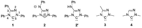 - Jonek, M.; Diekmann, J.; Ganter, C. First N-heterocyclic carbenes relying on the triazolone structural motif: Syntheses, modification and reactivity. Chem. Eur. J. 2015, 21, 15759–15768. [Google Scholar] [CrossRef] [PubMed]