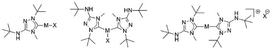 - Turek, J.; Panov, I.; Horáček, M.; Černošek, Z.; Padĕlková, Z.; Růžička, A. Amino-group functionalized N-heterocyclic 1,2,4-triazole derived carbenes: Structural diversity of rhodium(I) complexes. Organometallics 2013, 32, 7234–7240. [Google Scholar] [CrossRef]