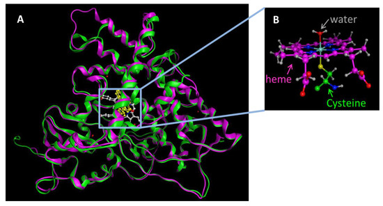 (A) The X-ray crystal structures of CYP1A1 (4I8V.pdb, pink) and CYP1A2 (2HI4.pdb, green) are superposed as ribbon model. Atoms are shown as ball and stick models. Heme is colored white and the substrate flavone is colored yellow. The total rmsd for these structures is 1.4 Å; (B) Native state of the heme bound to Cys sulfur atom as the fifth ligand and the water molecule as the sixth ligand.
