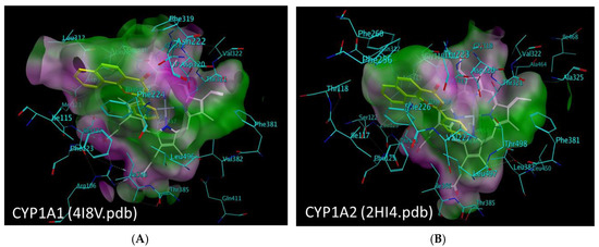 The molecular surface representation of the active site pocket of the (A) CYP1A1 and (B) CYP1A2 enzymes colored by lipophilicity where the pink region depicts hydrophilic region of the pocket and the green region depicts the lipophilic region of the pocket. The heme residue is represented as white stick model, the ligand (α-naphthoflavone) is shown as yellow stick model, and the enzyme residues are shown as cyan stick models.