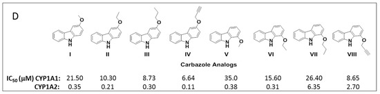 Structures and CYP1A1 & CYP1A2 inhibition data for (A) & (C) linear planar molecules and (B) & (D) triangular planar molecules [(A) and (B) reprinted from reference 34 with permission ].