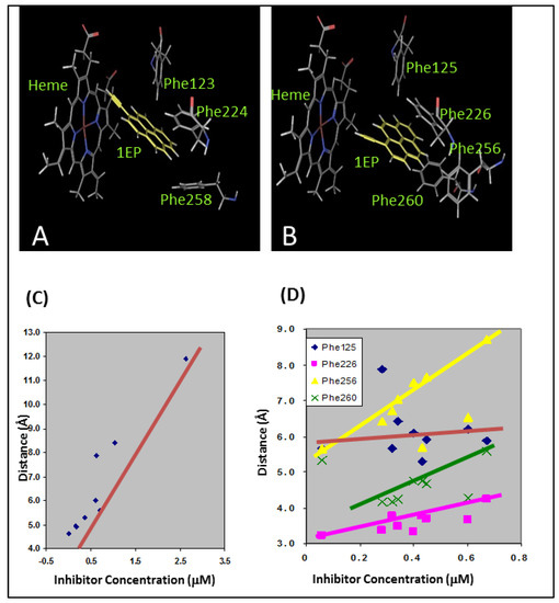 Arylacetylenes were developed by our group as time-dependent inhibitors of CYP1A1 and CYP1A2 [52]. These molecules are members of the PAHs with an acetylenic moiety as a substituent, which imparts the time-dependent inhibition via a reactive ketene intermediate. These molecules did not possess any polar groups and were incapable of hydrogen bonding interactions with the active site polar residues. All of the arylaceylenes made the critical edge-to-face and offset stacked π-π interactions with the Phe residues in the active site of the CYP1A enzyme (Figure 6A,B). For CYP1A1, the distance between the heme iron atom and the triple bond of the acetylene moiety determined the potency of the inhibitors (Figure 6C). In the case of CYP1A2, the π-π stacking interactions were found to be the most important determinants of the inhibition potency (Figure 6D).