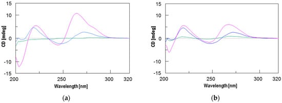 Circular dichroism (CD) spectra of: (a) PNA 1 (green), ODN (blue), and 1.5:1 1/ODN mixture (magenta); (b) PNA 2 (green), ODN (blue), and 1.5:1 1/ODN mixture (magenta). ODN is the DNA model sequence.