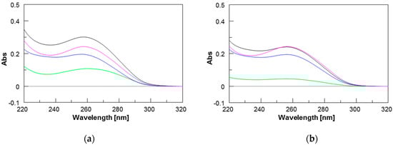 The formation of PNAs/ODN heteroduplexes was also monitored by UV spectroscopy by exploiting the hypochromic effect resulting from the formation of the heteroduplexes. The UV spectrum of each component alone and those of the mixtures are reported in Figure 3. All spectra were characterized by a maximum at around 260 nm, typical of nucleobases. The UV spectrum of the 1/ODN complex (magenta curve in Figure 3a) showed lower values of absorbance than the arithmetic sum of each component alone (black curve in Figure 3a), thus confirming the occurrence of stacking interactions and the formation of the heteroduplex. In the case of the shorter PNA 2, the UV spectrum of its complex with the ODN (violet curve in Figure 3b) showed almost the same values of absorbance as the arithmetic sum of its components, in agreement with the experimental lower stability of the shorter 2/ODN heteroduplex.