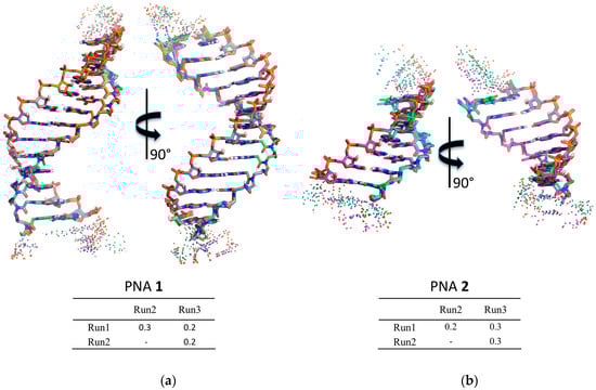 Molecular dynamics was used to check the structural features of the heteroduplexes 1/RNA and 2/RNA (Supplementary Materials, Table S1). The heteroduplexes were built starting from the NMR structure of the RNA(GAGUUC)/PNA(GAACTC) duplex (PDB-ID 176D) [29] as described in the Material and Methods section. The heteroduplexes were analyzed by means of three independent runs of molecular dynamics, for a total simulation time of 1200 ns for 1/RNA system and of 900 ns for 2/RNA. The chemical-physical properties of the systems, such as temperature, pressure, volume, density, and energy were fairly constant during the whole simulation for all the systems (data not shown). All the simulations were characterized by low root-mean-square deviation (RMSD) values and low fluctuations in the central duplex region (Supplementary Materials, Figure S1), thus indicating the presence of a stable structure. To evaluate the convergence between the independent runs of each system, a hierarchical clusterization of the molecular dynamics (MD) run was performed using Ambertools 15 [30]. The clusterization yielded in both cases one main cluster, accounting for more than 77% of frames for each run of PNA 1 and for more than 90% for PNA 2 runs (Supplementary Materials, Table S2 for details). Superposition of the average structure of the main cluster of each run showed very low RMSD values, thus indicating the convergence of the run to the same main structure (Figure 4; Supplementary Materials, Tables S3 and S4).