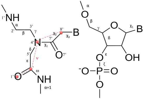 Interestingly, the analysis of the correlation between the torsion angle ε of the residue i and the torsion α(i+1) of the subsequent base, showed the lack of consistent correlation between εi and α(i+1). Moreover, to further explore structural features of PNAs/RNA heteroduplexes, we also evaluated the correlation between the pseudo-torsion angle νi, defined as the angle between C8′-N4′-C′-O1′ (Figure 5, red circles), and the torsion angle α(i+1) of the subsequent base, as a pointer of the orientation of the backbone carbonyl with respect to the strand terminus. The high Pearson correlation coefficients calculated revealed that there is a strong anti-correlation between the pseudo torsion angle νi and α(i+1) of the subsequent base, thus revealing a prevalent orientation of the carbonyl group toward the N-terminus (Supplementary Materials, Table S5). A detailed discussion of the torsion angle behavior is given in Supplementary Materials (Text S1).