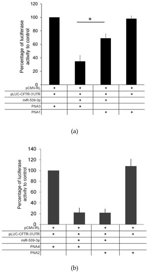 A549 human lung carcinoma cells were purchased from ATCC (Manassas, VA, USA). The cells were maintained in Dulbecco’s modified Eagle’s medium (Gibco Invitrogen, North Andover, MA, USA) with 10% heat inactivated fetal bovine serum (HyClone Laboratories, South Logan, UT, USA) without the addition of antibiotics. A Luciferase construct bearing the 3′UTR of the CFTR gene was used as the miR-509-3p sensitive reporter system. The transfection of the A549 cells with miRNA-mimics (Qiagen, Hilden, Germany) or PNAs was performed with the Attractene Transfection Reagent (Qiagen). Briefly, the cells seeded in 96-well plates were cotransfected with the luciferase reporter construct, miR-509-3p mimic and the PNAs. The luciferase activity level was measured 24 h after transfection using the Dual-Glo Luciferase Assay System (Promega Corporation, Madison, WI, USA). The EnSpire Multimode Plate Reader (Perkim Elmer, Waltham, MA, USA) was used for the luminescence assay using 96-multiwell black plates. The relative reporter activity was obtained by normalization to the Renilla luciferase activity.