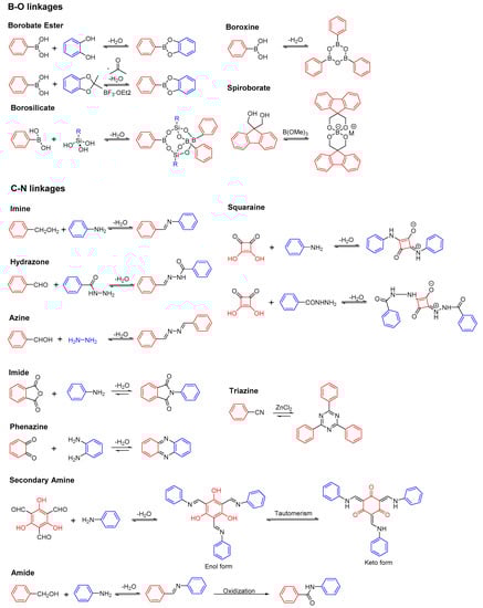 Several reversible reactions used for construction of COF materials. Dynamic reversible reactions are essential for the formation of crystal covalent organic frameworks (COFs). These reversible reactions for the formation of COFs are boron-containing linkages (for example, boroxine, boronate ester, borazine and spirobrate), nitrogen-containing linkages (for example, imine, hydrazone, azine, squaraine, phenazine, triazine, imide and azodioxy), and a double-stage linkage containing the boronate ester linkage and the imine linkage in one COF via a one-pot reaction.
