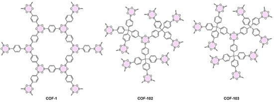 Chemical structures of classic boron-containing COFs (COF-1, COF-102, COF-103) with boroxine connections.