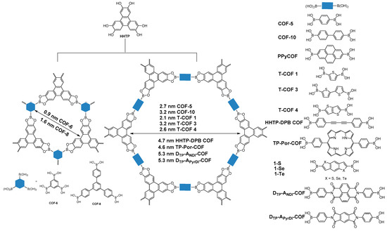 The cross-condensation of polybornic acids with catechols opened the way to stich different building blocks into one framework (Figure 3). The popular utilization of 2,3,6,7,10,11-hexahydroxytriphenylene (HHTP) as a triangular building block with ditopic, tirtopic and tetratopic boronic acids leads to 2D and 3D networks (Figure 3) [10,11,13]. With a sealed reaction system, COF-5, -6, -8 and -10 were successfully prepared in the cocktail solvent system by mixing mesistylene and 1,4-dioxane for 3–5 days at 85–100 °C [10,13]. A similar COF with the same HHTP as co-linker can be also prepared by stirring under an inert atmosphere [14].