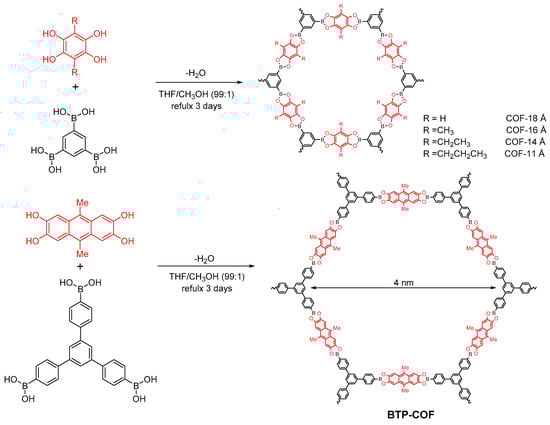 By using the tetrahydroxybenzene and its derivatives, 2D COFs can be prepared by stitching tritopic boronic acids together. The reactions were conducted in the mixture of tetrahydrofuran (THF) and methanol (MeOH) by stirring under an inert atmosphere [15,16].