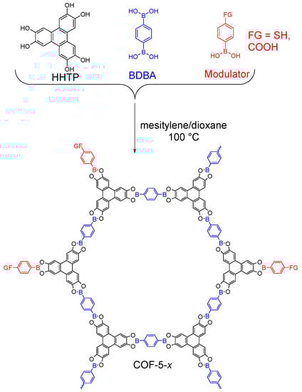 A modulation approach has been developed to control the structure and crystallinity of COF materials, introducing a modulator in the synthesis that can compete with one of the building blocks during the solvothermal COF growth to form highly crystalline frameworks with large domain size and very high porosity. Bein and co-workers used monoboronic acids as modulators in the solvothermal synthesis of the archetypical COF-5 to optimize the crystallinity, domain size, and porosity of 2D COFs (Figure 8). Moreover, the addition of the monoboronic acids also provides a potential construction of functional crystalline COF materials [23].
