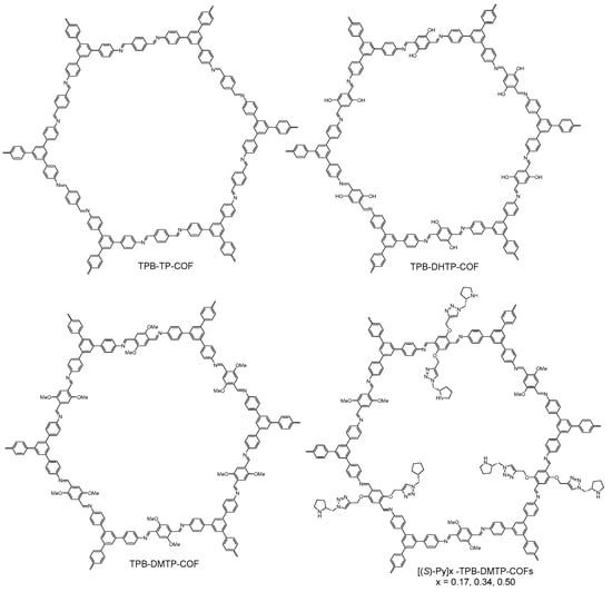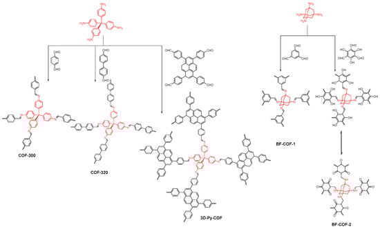 The first imine-linked COF was developed by Yaghi and co-workers in 2009 [25]. They constructed an imine-based COF (COF-300), which possesses a 3D five-fold interpenetrating diamond-like structure. COF-300 has a BET surface area of 1360 m2·g−1 and a pore size of 7.8 Å, which provides better hydrolytic stability compared to the boron-containing COFs. Moreover, the broad range of multifunctional amines and aldehydes provides a large number of structural possibilities for imine-based COFs.