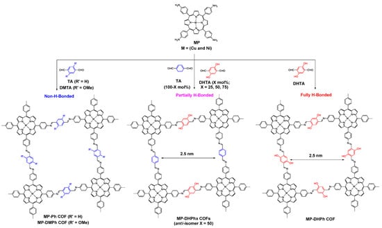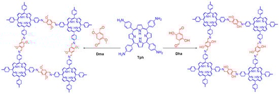 Syntheses of DmaTph and DhaTph by the condensation of square planar Tph building unit (blue) and linear Dma/Dha building unit (red). The introducing of -OH to the Schiff base [-C=N] centers in COFs can create an intramolecular [O-H···N=C] hydrogen bond to enhance both the chemical stability and crystallinity of COFs.
