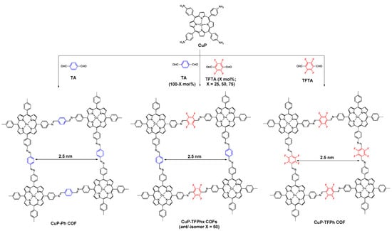 Schematic of the synthesis of 2D COFs integrated with self-complementary π-electronic forces (CuP−TFPhX, X = 25, 50, and 75 mol %) and the CuP−Ph and CuP−TFPh controls.