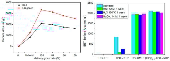 The surface area vs the methoxy group ratio in TPB-DMTP-COF (left). The BET surface areas of TPB-DMTP and (S)-Py-TPB-DMTP COFs use TPB-TP COF and TPB-DHTP COF as control.