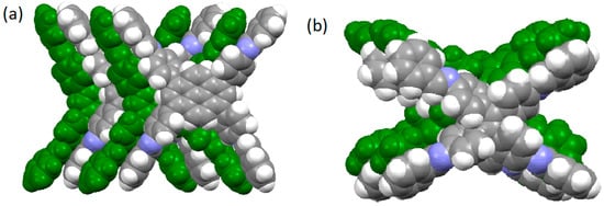 Different packing fashions between building units observed in the discrete model compounds of (a) 4PE-1P COF with 1,1,2,2-tetraphenylethene as the central unit and (b) Py-1P COF with 1,3,6,8-tetrakisphenylpyrene as the central unit, respectively.