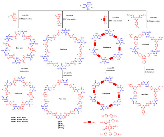 Construction of secondary amine-linked COFs via tautomerism by linking Tp with ditopic or tripic aniline-based linkers.