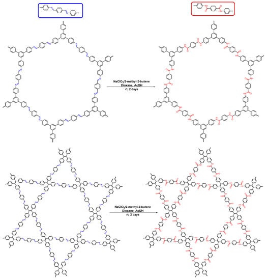 - Waller, P.J.; Lyle, S.J.; Popp, T.M.O.; Diercks, C.S.; Reimer, J.A.; Yaghi, O.M. Chemical conversion of linkages in covalent organic frameworks. J. Am. Chem. Soc. 2016, 138, 15519–15522. [Google Scholar] [CrossRef] [PubMed]