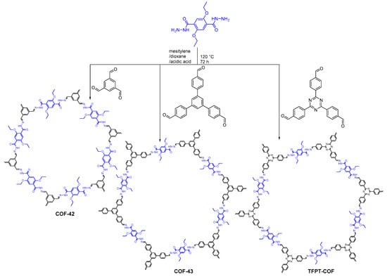 Synthetic reaction of hydrazone-linked COFs (COF-42, COF-43, and TFPT-COF).