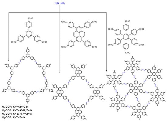 Synthetic reaction of azine-linked COFs (Py-Azine COF, HEX-COF 1, and Nx-COF).