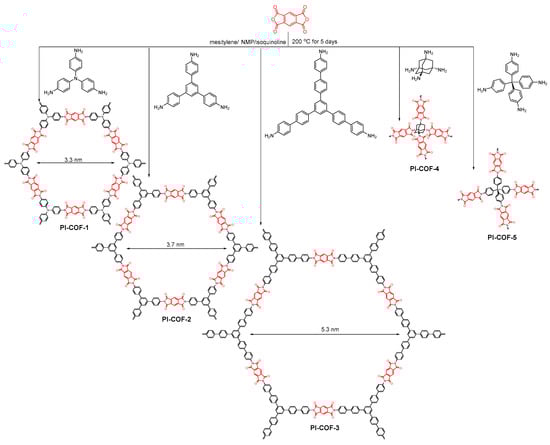Polyimides are formed by condensing primary amines and anhydrides (Figure 22). Yan and co-workers synthesized three-dimensional porous crystalline polyimide covalent organic frameworks (PI-COFs) by choosing tetrahedral building units of different sizes [50].