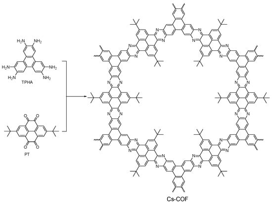 Aza-fused linkages were pursued in making conductive organic materials that have many potential applications in electrochemical devices [52]. However, the great challenge is how to make them highly crystalline. Jiang and co-workers prepared a phenazine-linked COF (CS-COF, Figure 23) through ring-fusing reactions between quinone and amine derivatives catalyzed by acidic forms. They used C3-symmetric triphenylene hexamine (TPHA) and C2-symmetric tertbutylpyrene tetraone (PT) as building blocks to prepare the crystalline phenazine-linked CS-COF under solvothermal conditions. The polygon skeletons of CS-COF are highly π conjugated and chemically stable in various solvents [53].