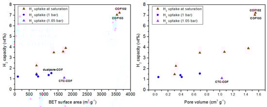 Plot of H2 uptake against BET surface area (left) and pore volume (right) for the selected COFs at 77 K.