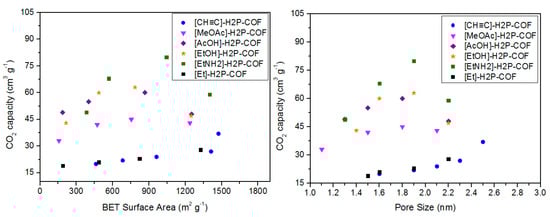 Plot of low-pressure CO2 uptake against BET surface area (left) and pore size (right) for the selected COFs at 273 K and 1 bar.