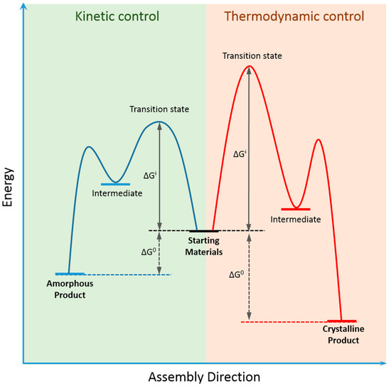In order to achieve higher reversibility for efficient error correction during crystallization, dynamic covalent chemistry (DCC) has been well applied in the construction of COFs. To stitch discrete molecular building blocks into periodic networks, DCC enables strong covalent bond formation accompanied by the assembly of molecular building blocks into predetermined spatial arrangements [7,8]. Considering the possible spatial arrangements of the moiety formed in the reaction, there are multiple products in the equilibrium with various degrees of crystallinity. Such reversible assembly of molecular components can proceed along kinetic or thermodynamic pathways (Scheme 1). Due to the lower barrier of activation (ΔG‡), kinetic intermediates dominate initially due to a fast rate of formation the kinetic products, which can be trapped during quenching of the reaction and form amorphous products with the gain of entropy from their randomness of arrangement, meanwhile the thermodynamic products have the lowest overall Gibb’s free energy (ΔG°), so that given the opportunity the reaction will re-equilibrate towards the global minimum to form the most stable and probably crystalline products. It is also possible that the kinetic products can also be transformed into thermodynamic products by using certain thermo-treatments for recrystallization. It is common in COF chemistry that amorphous products are initially obtained until the synthetic conditions are optimized by varying the crystallization times, reaction temperatures, reaction solvents, and catalysts (such as acids, bases, and metal salts acting as Lewis acids). The discovery process may change the activation energy of thermodynamic products and their reaction rates to accelerate the crystallization of COFs. On the other hand, rational design of building blocks may also increase the correctness of the assembly of molecular components, thus enhance the crystallinity of the obtained products. It is generally believed that 2D COFs are easier to form having less probability of resulting in networks than the 3D ones with more structural diversity.