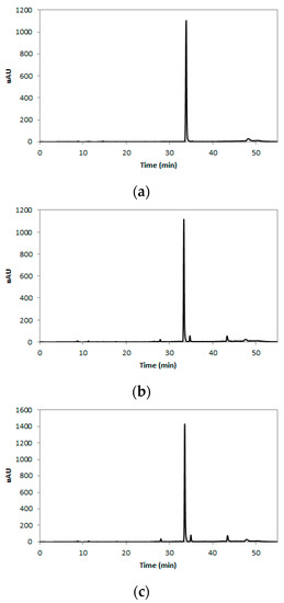 HPLC chromatogram of rutin in TBEs. Rutin standard (a); TBE-50 (b); TBE-70 (c).