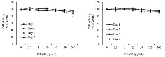 TBEs were tested for the potential cytotoxic effects that might exert on 3T3-L1 cells. Cells were treated with TBE-50 or TBE-70 at various concentrations (0 (control), 0.1, 1, 10, 50, 100, or 500 μg/mL), and incubated for 1, 2, 5, or 7 days. Cytotoxicity was unaffected by 0, 0.1, 1, 10, 50, and 100 μg/mL of TBE-50 and TBE-70 after 7 days of incubation (Figure 4). However, 7 days of incubation with high doses (500 μg/mL) of TBE-50 and TBE-70 significantly decreased cell viability by 13.2% and 10.3%, respectively, compared to the control. The cells did not show any toxicity upon treatment with TBE-50 and TBE-70 at concentrations of 0.1–100 µg/mL. Therefore, this in vitro study was performed at a nontoxic range of concentrations below 100 μg/mL with both extracts.