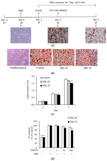 Effects of TBEs on intracellular lipid accumulation and TG content during adipocyte differentiation. Scheme of the 3T3-L1 preadipocyte differentiation experiment (a). 3T3-L1 cells were treated with 100 µg/mL of TBE-50 or TBE-70, and incubated for 2, 5, or 7 days (d2 to d9). On Day 7 (d9), change of adipocyte differentiation was presented with Oil Red O staining (b). Intracellular lipid content (c) was stained with oil-red O dye, and dissolved the stained oil droplets with isopropanol and quantified by spectrophotometric analysis. Representative cell images were captured at 200× magnification. 3T3-L1 cells were treated with 0 (MDI treated control), 1, 50, and 100 µg/mL of TBE-50 and TBE-70, and incubated for 7 days. Intracellular TG content (d) was determined using enzymatic colorimetric methods. MDI, medium containing 3-isobutyl-1-methylxanthine, dexamethasone and insulin. Values are expressed as mean ± SE (n = 3) of three independent experiments. * p < 0.05, ** p < 0.01 and *** p < 0.01 vs. MDI-treated control. # p < 0.05 vs. TBE-50.