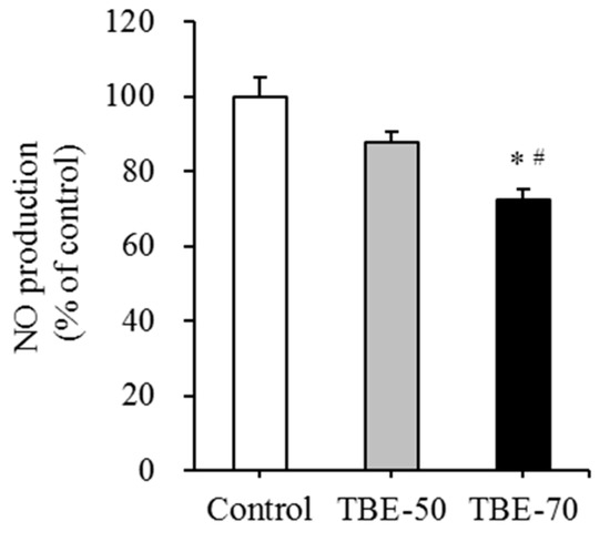 Effects of TBEs on NO production in adipocytes. 3T3-L1 adipocytes were treated with 100 µg/mL of TBE-50 or TBE-70, and incubated for 7 days. The production of NO was measured using Griess reagent. Values are expressed as mean ± SE (n = 3) of three independent experiments. * p < 0.05 vs. control. # p < 0.05 vs. TBE-50.
