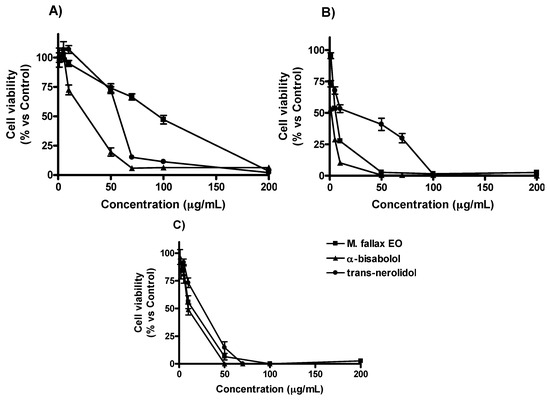 Effects of M. splendens essential oil (EO), α-bisabolol and trans-nerolidol on viability of A549 (A), MCF-7 (B) and HaCaT (C) cell lines. Cytotoxicity was assessed by MTT test after 48 h.