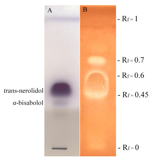 However, results obtained indicated that phytopathogens strains were more sensitive than human pathogens after treatment with the tested essential oil. In particular, the Gram positive C. michiganensis subsp. nebraskensis resulted the most sensitivity, evidencing the lowest MIC value of 125 μg/mL. Gram negative bacteria showed resistance to M. splendens essential oil except for P. syringae pv. syringae that showed the lowest MIC value of 250 μg/mL. HPTLC-bioautography on S. aureus (Figure 2) exhibited two different areas corresponding to the fractions Rf 0.45–Rf 0.6 and Rf 0.7. The Rf 0.45–Rf 0.6 TLC area appeared as the most bioactive in terms of antibacterial activity and it was totally characterized by trans-nerolidol (100%). The fraction Rf 0.7 was mainly composed by β-cedren-9-one (87.34%). Data obtained suggested that trans-nerolidol is mainly responsible for the antibacterial activity of M. splendens essential oil that is in accordance with the results obtained by various authors. Simoes et al. [] found that trans-nerolidol in combination with synthetic antibiotics ciprofloxacin, erythromycin, and gentamicin enhances their antibacterial activity against S. aureus and E. coli. Essential oils containing trans-nerolidol have been reported to inhibit the growth of quite a number of bacteria including S. aureus [,,], S. epidermidis [], E. coli, and P. aeruginosa [,]. Nerolidol (a mixture of cis- and trans-nerolidol) is also used as a food flavoring agent []. Considering β-cedren-9-one, the main component of Rf 0.7 fraction, few literature references are reported: to the best of our knowledge, this sesquiterpene is the main compound of Artemisias persica root essential oil [], but no data are available for its antibacterial properties.