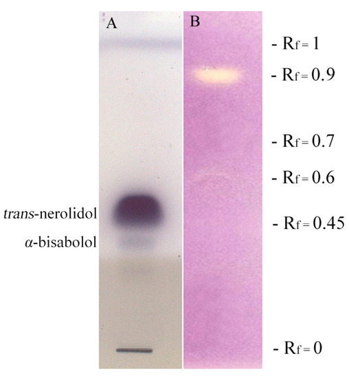 The HPTLC bioautography was carried out on human pathogen S. aureus, with the aim of defining particular constituents of M. splendens essential oil that are able to determine the antibacterial activity. The bacterium choice was led because of its high performance features on HPTLC plate assay. The assay was performed as follows: 30 μL of a solution of M. splendens essential oil (110 mg/mL in ethanol) were applied on two separate HPTLC plates as 10 mm wide bands with Linomat V (Camag), while 10 μL of a methanol solution of trans-nerolidol (25 mg/mL) and 10 μL of a methanol solution of α-bisabolol (8 mg/mL) were applied on a third one on the same spot, as a 10 mm wide band. Then, all plates were eluted with a solvent solution containing toluene/ethyl acetate/petroleum ether (93/7/20). Finally, the solvent was completely dried maintaining plates for 30 min at room temperature: the first one was disposed in Petri dishes together with Nutrient Agar medium previously added with the bacterial inoculum (105 CFU/50 mL) and 0.25% of a 2,3,5-triphenyl-tetrazolium chloride water solution (20 mg/mL), as a growth indicator. Incubation occurred overnight at 37 °C. Antibacterial compounds, responsible for possible antibacterial properties, looked like yellow spots against a red colored background. The second plate was used to remove active spots on silica and to extract these in methanol solutions that was directly analyzed by GC-MS, while the third one was sprayed with vanillin-phosphoric acid reagent to visualize trans-nerolidol and α-bisabolol as reference standards [].