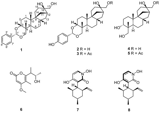 By comparison of the NMR and MS data with those reported, compounds 2–8 isolated from the crude extract were identified as inflatin A (2), inflatin B (3), aphidicolin (4), aphidicolin-17-monoacetate (5), gulypyrone A (6), pyridoxatin rotamers A (7) and B (8), respectively.