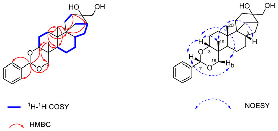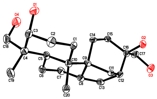 The relative configuration of 1 was determined on the basis of NOESY data (Figure S6) and by comparison with that of aphidicolin (4). NOESY correlations of H-1′ with H-3 and H-18b, H-3 with H-18b and H3-19, H3-19 with H3-20, H3-20 with H-8 revealed their proximity in space (Figure 2). The remaining portion of 1 was deduced to have the same relative configuration as their counterparts in 4 [7], which was confirmed by single-crystal X-ray diffraction analysis (Figure 3).