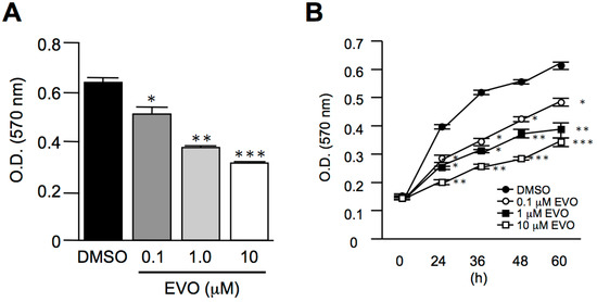 Evodiamine inhibited Homo sapiens hepatocellular carcinoma, HepG2 cell proliferation. Homo sapiens hepatocellular carcinoma and HepG2 cells were treated with different doses of evodiamine for 24 h (A) or treated with 10 μM evodiamine and harvested at the indicated periods (B). The cells were then incubated with 0.2 mg/mL MTT in culture medium for three hours. The absorbance was measured at a wavelength of 570 nm. The data are expressed as means ± S.E.M. and obtained from two independent experiments with three replicates for each experiment. * p < 0.05, ** p < 0.01, and *** p < 0.001 compared with the control group.