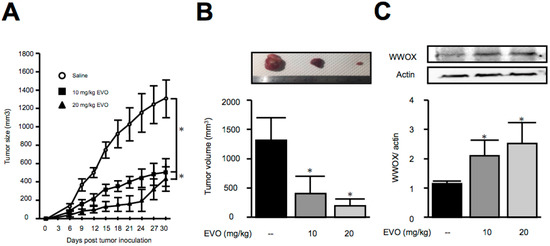 Evodiamine decreased tumor size in Hepa1-6 hepatoma-bearing mice. Hepa1-6 cells were subcutaneously injected in mice on day 0. The indicated doses of evodiamine were treated by oral gavage for 27 consecutive days. The tumor volume was determined by direct measurement with calipers and calculated every three days. (A) On day 30, the animals were sacrificed, and the tumors were removed (B) for the detection of WWOX expression (C). The results are expressed as means ± S.E.M. n = 20. * p < 0.05 compared with control group.