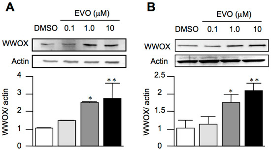 Evodiamine increased the expression of WWOX in both liver cancer cell lines. Mus musculus (A) and Homo sapiens (B) hepatocellular carcinoma cells were treated with different doses of evodiamine, as indicated, for 12 h. The WWOX levels were determined by Western blot analysis. The data are expressed as means ± S.E.M. and obtained from four independent experiments. * p < 0.05, and ** p < 0.01 compared with the control group.