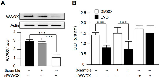 Evodiamine inhibited HepG2 cell proliferation through a WWOX-dependent pathway. (A) HepG2 cells were treated with scramble siRNA or siRNA targeted to WWOX (siWWOX). The knockdown of WWOX was evaluated using Western blot analysis; (B) After the transfection of scramble siRNA or siWWOX for 48 h, the cells were treated with 10 μM evodiamine for 24 h. The cell viability was determined by MTT assay. The data are expressed as means ± S.E.M. and obtained from four independent experiments. *** p < 0.001 as compared with the indicated groups.