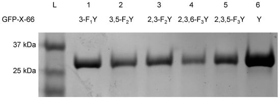 In order to investigate the effect of fluorotyrosine residues on GFP fluorescence, mutant proteins were expressed using E. coli cells co-transformed with a pEVOL-3FY plasmid harboring both the aaRS and the tRNA, and a pET-GFP-TAG66 plasmid containing the GFP gene with a TAG codon introduced at residue 66. Due to the ability of the aaRS to recognize and incorporate multiple fluorotyrosine derivatives, these cells could be utilized for the expression of all five mutant proteins. The cells were induced with additions of isopropyl β-d-1-thiogalactopyranoside (IPTG) and arabinose to express GFP in the presence or absence of the fluorotyrosines: 3-fluorotyrosine (3-F1Y, 1), 3,5-difluorotyrosine (3,5-F2Y, 2), 2,3-difluorotyrosine (2,3-F2Y, 3), 2,3,5-trifluorotyrosine (2,3,5-F3Y, 4), and 2,3,6-trifluorotyrosine (2,3,6,-F3Y, 5) (Figure 1). A control expression was also performed with wild-type GFP that contained the standard tyrosine at residue 66. Gratifyingly, full length GFP was obtained only in expression cultures grown in the presence of one of the fluorotyrosine UAAs, whereas no detectable protein was obtained in the absence of the UAA (Supplementary Material, Figure S1). As this is a previously evolved aaRS, the presence of protein and spectral shifts confirm incorporation of the fluorotyrosines. The proteins were then purified and analyzed by gel electrophoresis and mass spectrometry to confirm appropriate molecular weight and purity (Figure 2, Supplementary Material Figure S2).