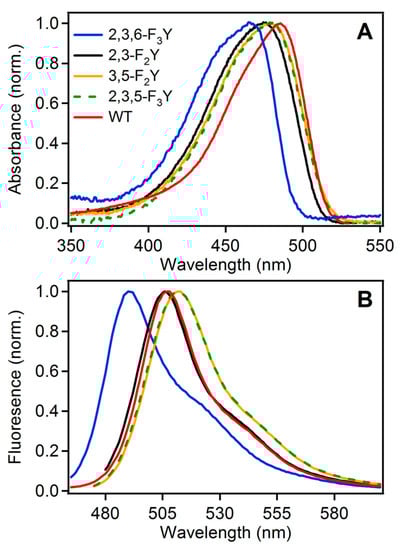 With the four fluorotyrosine sf-GFP (super-folded green fluorescent protein) mutants in hand, we next investigated their fluorescent properties. It is important to note that this particular GFP has been previously engineered to favor the deprotonated state, thus allowing us to examine the electronic effect of the fluorine substituents directly on the phenolate form without adding confounding spectral data associated with the protonated phenol state. To identify potential spectral shifts in their fluorescence, absorbance measurements were first conducted (Figure 3A). The wild-type GFP exhibited the most red-shifted absorbance with a λmax at 483 nm, in accordance with literature values (Table 2). With the subsequent addition of fluorine substituents to the fluorophore, a blue-shift was observed, with the greatest shift occurring for the 2,3,6-F3Y mutant (λmax = 465 nm). The addition of subsequent electron withdrawing fluorines has previously been demonstrated in various aromatic chromophores, and may lead to a stabilization of the HOMO, resulting in an increased energy required for the electronic transitions. After obtaining the λmax values for each mutant, we next sought to investigate their fluorescent properties. Exciting the proteins at the appropriate wavelengths obtained by absorbance measurements, emission spectra were obtained for each GFP mutant (Figure 3B). The most dramatic fluorescent shift relative to the wild-type GFP was again observed with the 2,3,6-F3Y mutant, which was significantly blue-shifted. Interestingly, the 2,3,5-F3Y and the 3,5-F2Y mutants generated a red-shift in the emission spectrum, while the 2,3-F2Y was slightly blue-shifted from the wild type protein (Table 2). We hypothesize that the inclusion of two fluorine substituents in the ortho-positions to the phenol may result in a stabilization of the HOMO, as the fluorines are able to better stabilize the negative charge buildup on the ortho-carbons. This negative charge buildup is only stabilized in one resonance form for the 2,3-F2Y and 2,3,6-F2Y mutants, potentially contributing to the observed blue shift. Again, with this particular GFP protein, we are observing the spectra attributed to the deprotonated tyrosine residue so all shifts can primarily be correlated to the effect of the fluorine substituents and not the protonation state of the phenol.