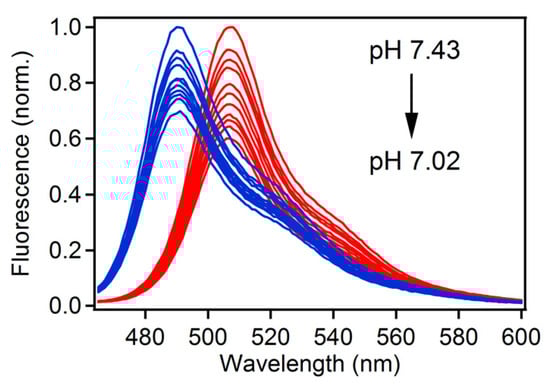 Fluorescence spectra wild-type GFP (red) and 2,3,6-F3Y GFP (blue) when titrated with 0.1 M HCl. The pH difference between each measurement was approximately 0.07 pH units.