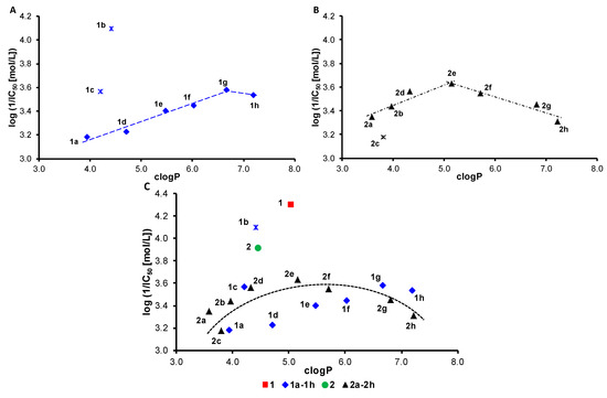 The dependence of the PET-inhibiting activity expressed as log(1/IC50 [mol/L]) of compounds 1, 1a1h and 2, 2a2h in spinach chloroplasts on lipophilicity expressed as clogP is shown in Figure 1A,B, while Figure 1C illustrates this dependence for all investigated compounds 12h.