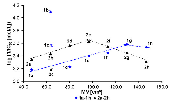 Figure 2. Dependence of PET-inhibiting activity log(1/IC50 [mol/L]) of carbamates 1a1h and 2a2h in spinach chloroplasts on bulkiness of R2 substituents expressed as molar volume MV [cm−3] of alkyl tail of compounds.